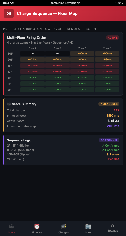 This matters practically because multi-floor implosion planning involves multiple stakeholders reviewing the same sequence. When the sequence lives in a visual score format, a structural engineer reviewing column interdependencies and a safety officer reviewing exclusion zone timing can both read the same document. There is no version mismatch between the structural plan and the blast plan.