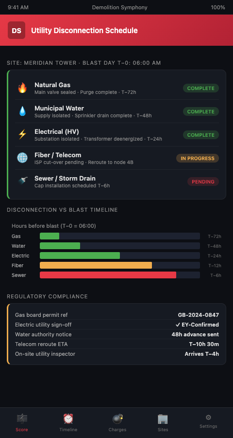 Think of each utility service as a separate instrument in the pre-implosion orchestra that must complete its part before the conductor can raise the baton for the shot. Electric disconnects first — its absence allows the building to be entered safely. Gas disconnects second and requires the longest lead time. Water and sewer come next, followed by telecommunications. Each instrument has its own timeline, and the conductor — the implosion project manager — must track all of them simultaneously against the fixed shot date.