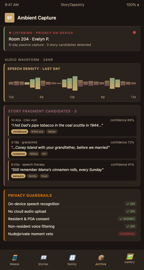 StoryTapestry's ambient capture module sits at the intersection of consumer technology, care-sensor infrastructure, and narrative preservation. Rather than recording everything, it listens for story-shaped utterances — personal anecdote structure, autobiographical references, extended narration — and flags these moments for optional capture with explicit consent. The default state is off; the activation state is opt-in at the individual, family, and facility level.