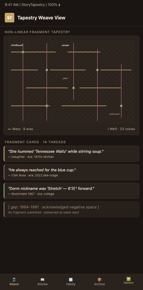 The shift StoryTapestry proposes is treating fragmentation as the default structure. A tapestry is built from short threads by design. No single thread carries the whole pattern, and gaps are not failures but negative space that defines what is present. The platform applies this to memorial building by letting contributors submit memory fragments of any length, tagged by era, theme, or relationship, and weaving them into an interactive tapestry that readers can explore non-linearly.
