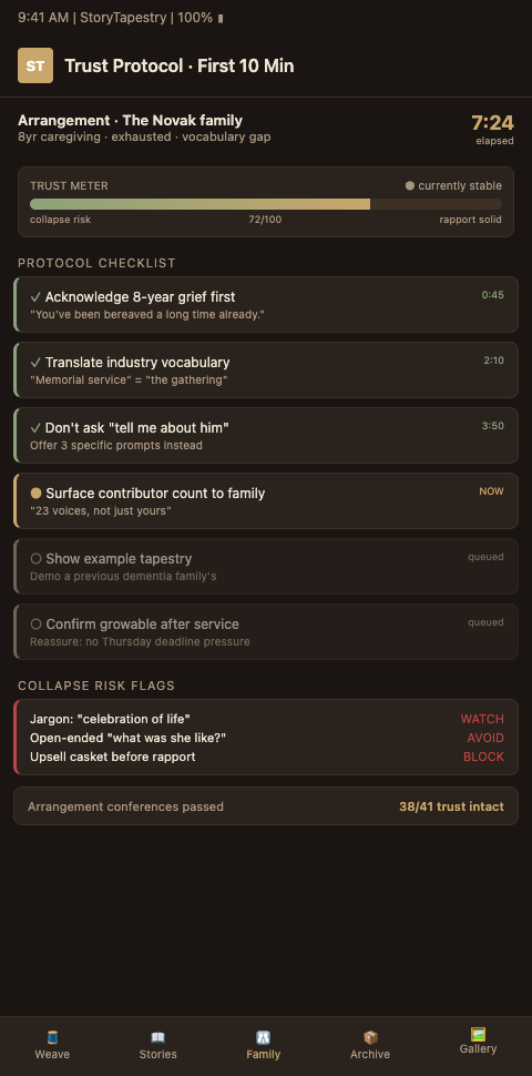 StoryTapestry's intake workflow is built on the premise that trust is itself a thread in the memorial tapestry, not a preliminary step before the "real" work begins. The tapestry metaphor matters because a memorial woven without the family's confidence will show its weak threads at the service; every dementia family has a finely tuned detector for whether the funeral director actually listened or processed them through a template. Japanese survey research on funerals mediating grief shows that psychosocial outcomes correlate strongly with families feeling that the service authentically reflected the deceased and their circle (ScienceDirect - Funerals Psychosocial Impact).