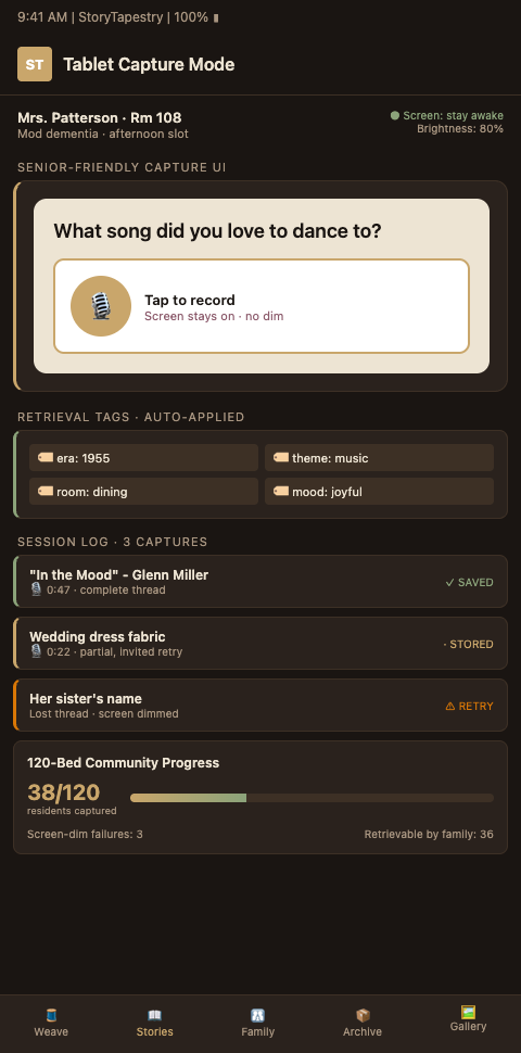 StoryTapestry is designed for the realities of assisted living story collection: short sessions, variable cognitive days, shift-based staff, and the eventual handoff to funeral home partners when a resident passes. The tapestry metaphor works because a resident's life in an assisted living community is never captured in one sitting. Stories come in 8-minute fragments between physical therapy and dinner, often triggered by a song at Tuesday choir or a scent from the kitchen on Thursday. The platform accumulates these fragments across months or years and weaves them into a persistent narrative that the facility owns and families access.
