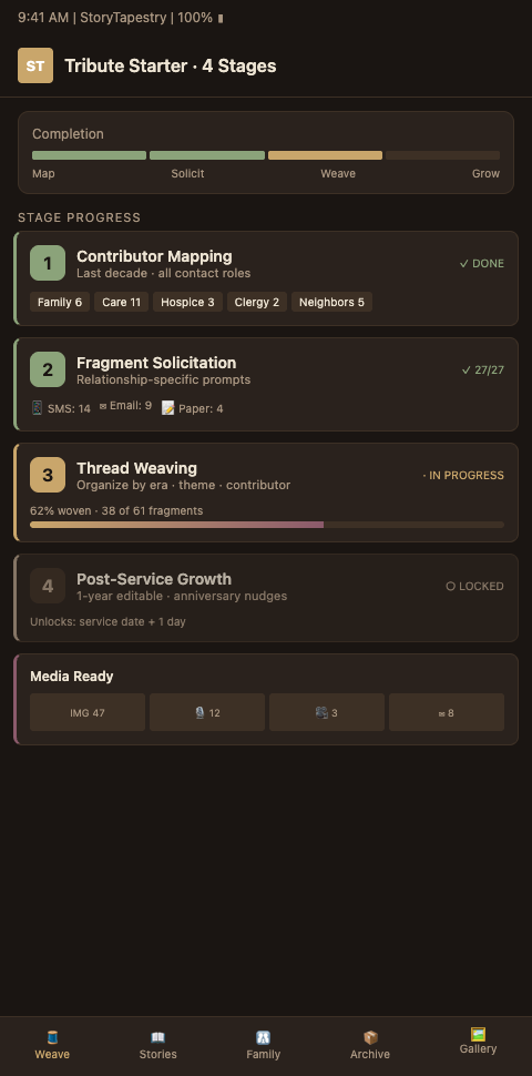 The practical starter sequence runs in four stages. Stage one is contributor mapping. List every person who interacted with the patient during their last decade — family, CNAs, activity staff, hospice team, neighbors, clergy. Stage two is fragment solicitation. Route relationship-specific prompts via text, email, or paper form. Stage three is thread weaving. The platform organizes fragments by era, theme, and contributor, presenting a browsable tapestry rather than a linear bio. Stage four is post-service growth. The tribute stays editable for a year, with nudges to family as anniversary dates approach.