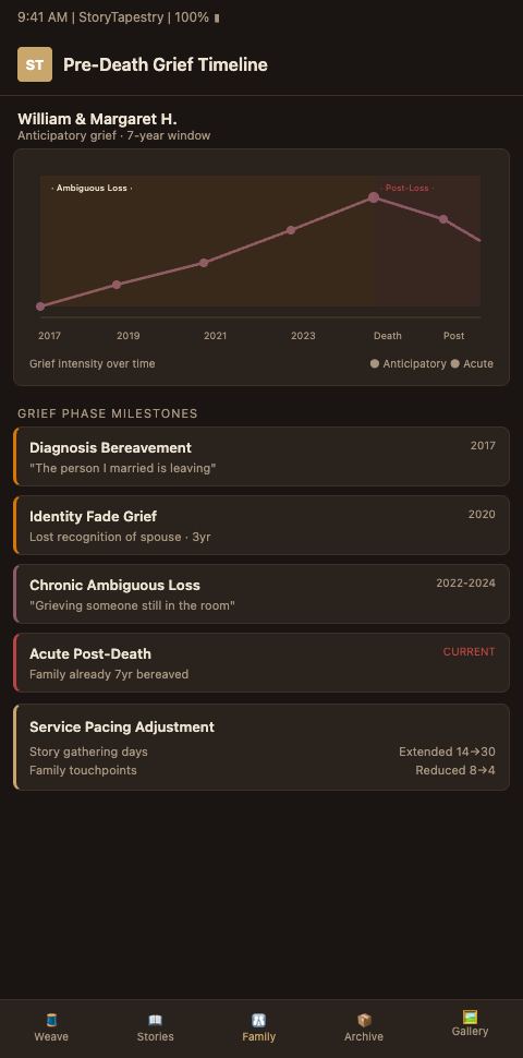 Contradictory Memory Reconciliation carries unusual weight for pre-death grief. Family members often disagree about when the person "really" became unreachable. The tapestry preserves these disagreements as parallel threads, acknowledging that one sibling may have experienced the loss years earlier than another. Grief timelines in dementia simply do not match the standard bereavement expectations the industry was built around.