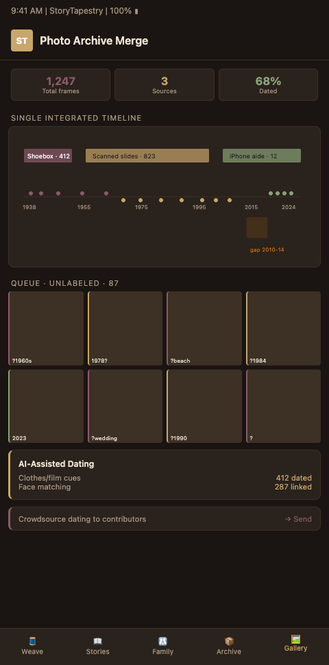 StoryTapestry treats each caregiver's photo collection as a narrative thread rather than a file dump. Instead of asking families to merge everything into a single folder, the platform accepts separate uploads from each contributor and preserves the source attribution through the final memorial display. The daughter's shoeboxes become one thread, the brother's slides another, the memory care aide's phone pictures a third. The tapestry metaphor matters here because no single caregiver saw the whole life, and pretending otherwise produces a flattened, generic tribute.