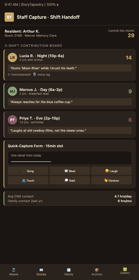 Caregiver Fragment Collection operationalizes the philosophy. Staff contribute 90-second voice memos at shift handoff, short text threads during breaks, or photo uploads when residents are engaged in meaningful activity. Contributions are logged by staff member and stored in the resident's tapestry. When the resident dies, the memorial already contains dozens of staff threads. The family meets a tapestry that surprises them with specificity and is spared the burden of asking exhausted staff to reconstruct years of observation on short notice.