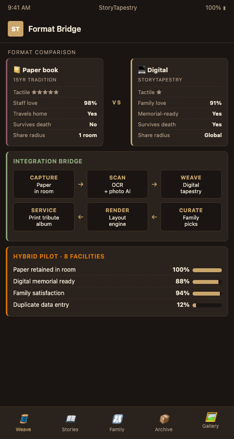 StoryTapestry is designed to complement, not replace, paper life story work in memory care settings. The tapestry metaphor is load-bearing here because the final memorial is strongest when it contains both digital threads (searchable, shareable, updatable, enduring through cloud storage) and paper threads (tactile, gift-able, placeable at the service, survivable through the home environments of grieving families). Age UK Sheffield's life story toolkit documents how paper life story work supports the person with dementia during life (Age UK Sheffield - Life Story Work); StoryTapestry extends the same life-story content into digital memorial assembly at the end of life.
