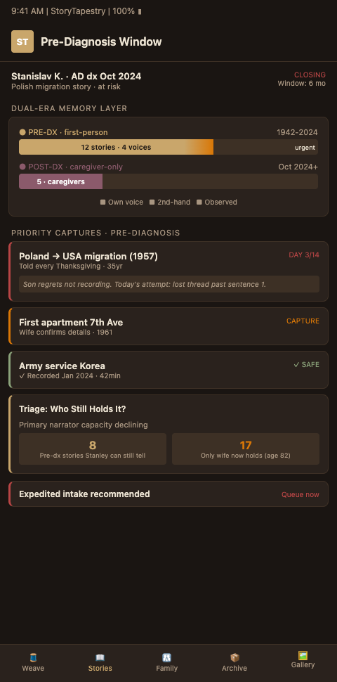 StoryTapestry's Pre-Decline Proactive Gathering feature exists specifically to close this window earlier. When a memory care facility or neurology practice refers a family to their partner funeral home at MCI diagnosis, the pre-decline story capture protocol activates before moderate-stage symptoms make direct narration impossible. The tapestry metaphor is load-bearing here: pre-diagnosis threads and caregiver-era threads weave together to produce a complete life, where either alone would produce a distorted tribute that either denies the dementia years or defines the person entirely by their decline.