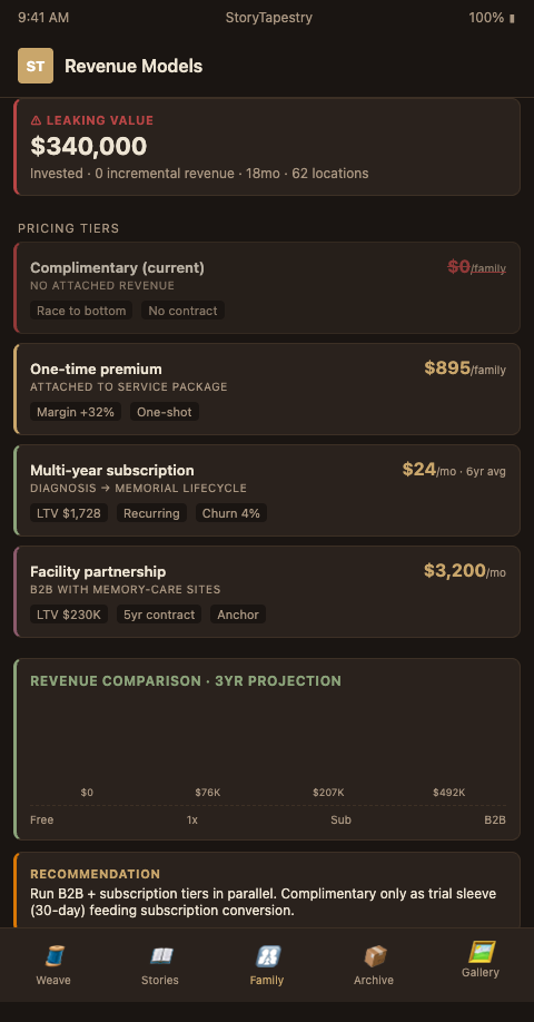 Thread one is subscription capture. Families pay a monthly fee — typically $40-$80 — for active tapestry infrastructure during the decline. This includes quarterly interview sessions with the funeral home, ambient capture integration with the partnered memory-care facility, and ongoing threading and reconciliation as new fragments arrive. Over a five-year decline, a subscription at $60/month produces $3,600 of revenue that did not exist in the traditional funeral model.