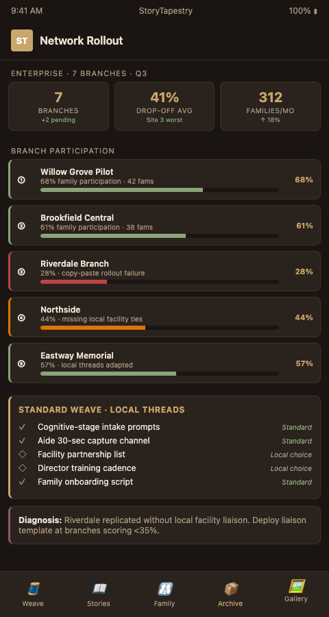Cross-branch learning accelerates rollout. A branch that cracks a difficult partnership configuration — say, a tri-county network of small memory-care homes with no central administration — should not be an isolated success story. StoryTapestry's network dashboard surfaces these pattern wins, and enterprise rollout teams use them as templates for structurally similar branches. The logic mirrors how franchise networks share playbooks across territories: locally adapted, structurally unified.