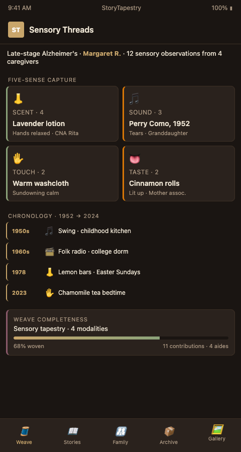 Multisensory toolkits for dementia reminiscence have been developed in research settings and translate directly to memorial contexts (Springer - Multisensory Toolkit Reminiscence). StoryTapestry's sensory intake structures four capture modalities beyond music: scent (which flowers, foods, perfumes, or environments), touch (fabrics, temperatures, textures that soothed or activated), taste (foods the patient still reached for even late in the disease), and environmental sound (birdsong, traffic, ocean, specific voices). These fragments combine with conflicting memory reconciliation to produce a memorial where sensory recognition supplements verbal narrative.