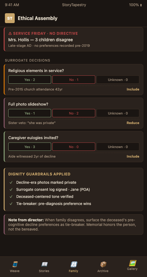 The second principle is consistent-character representation. When documented preferences are absent, surrogate decisions should honor the character the deceased consistently demonstrated while autonomous. Research on informed consent in Alzheimer research emphasizes that surrogate decision-making requires attention to substituted judgment, not best-interests substitution (PMC - Informed Consent Alzheimer Research). A woman who privately treasured classical music but publicly attended hymn-filled services all her life has two consistent characters; StoryTapestry surfaces this tension during intake rather than letting family members project their own preferences.