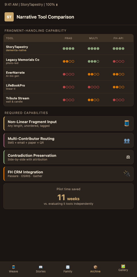 Pilot partners receive direct access to the StoryTapestry product roadmap, concierge integration support for the adjacent tools your firm already uses, and supervised evaluation assistance to help your directors distinguish fragment-first from narrative-first capabilities in the broader market. Your feedback shapes the production release of the integration spec, the TCO evaluation templates we publish for the industry, and the vendor stability documentation that helps funeral homes protect their families from shutdown risk. As an early partner, your firm builds operational fluency with fragment-first memorial assembly before the market matures, which means your directors are ready when the larger industry catches up to the capabilities your partner facilities will begin demanding. Reserve your pilot slot to move your firm from the generic life story software that frustrates dementia families toward the tapestry-capable infrastructure your market will soon expect as baseline.