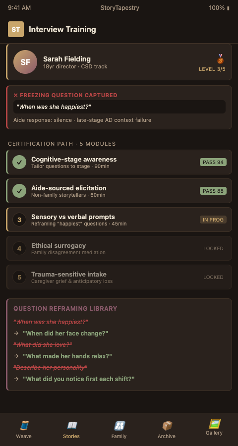 Module three — handling knots — is where cognitive-sensitive interviewing distinguishes itself from generic grief counseling. Knots are contradictions, trauma disclosures, caregiver collapse, and family conflict that surface during interviews. The module teaches de-escalation, referral criteria (when to pause the interview and refer to clinical grief support), and contradiction-documentation protocols. Trainees role-play scenarios drawn from real StoryTapestry case files (de-identified), including the moment when a caregiver discloses that the decedent hit her during a late-stage agitation episode. What do you do with that fragment? The answer is not simple.
