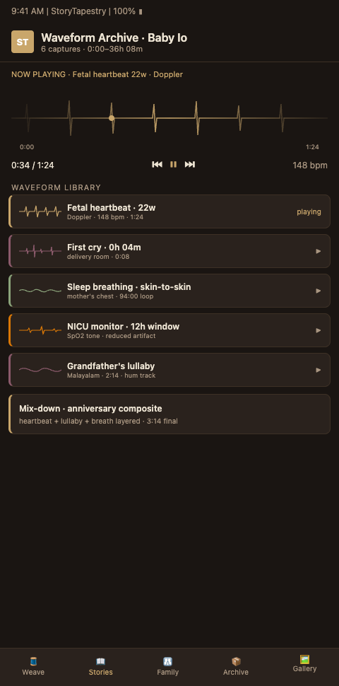The waveform visualization matters because audio is ephemeral, but the shape of sound can be permanent. A 47-second lullaby, visualized as a waveform, becomes a line drawing of the mother's voice that exists as visual art even when the audio is not playing. The family places it in a nursery frame alongside other physical artifact keepsakes preserved from the hospital stay. The sibling traces its peaks with her finger. The father commissions it as a tattoo. The tapestry metaphor holds: the waveform becomes the luminous thread that runs through the other threads, visible and touchable rather than only audible.