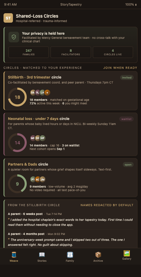 StoryTapestry extends the tapestry metaphor to community: each family's memorial is a tapestry, and bereaved parent communities are looms where multiple tapestries sit in visible proximity — preserving each family's privacy while offering the comfort of knowing other tapestries exist nearby. The platform offers four specific community pathways that hospital bereavement programs can offer families without replacing the specialized peer support organizations that already exist.