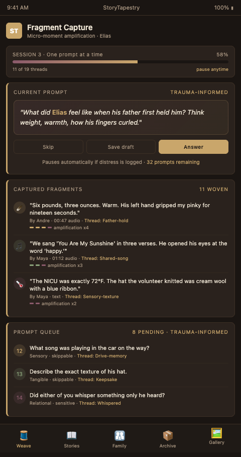 Moment-by-moment parent prompts. Rather than asking "tell us about your baby," which overwhelms, StoryTapestry asks thirty small questions spread across thirty days — a structure that also underpins our work on pregnancy loss storytelling depth. What did her hair smell like. What was the first thing you noticed about her hands. What song was playing when you drove to the hospital. Therapeutic writing research with grieving mothers shows that assigning meanings through specific, structured writing reduces the intensity of grief pain over time. StoryTapestry borrows this principle and adapts it for memorial construction — each answer becomes a thread, and the thread weaves into the larger tapestry whether the parent wrote three sentences or thirty.