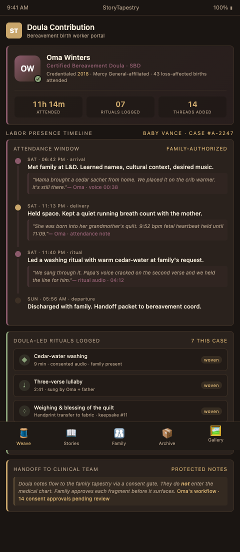 Co-contributor workflow between doula and hospital staff. In labor, the bereavement doula and the primary nurse often both observe the same moments from different angles, and the sibling memorial voice capture infrastructure we built follows the same parallel-perspective logic. StoryTapestry supports parallel contribution from both roles, with clear attribution so the family can see whose perspective each thread represents. The doula's observation of the mother's breathing alongside the nurse's observation of the baby's monitor readings creates a richer record than either alone.