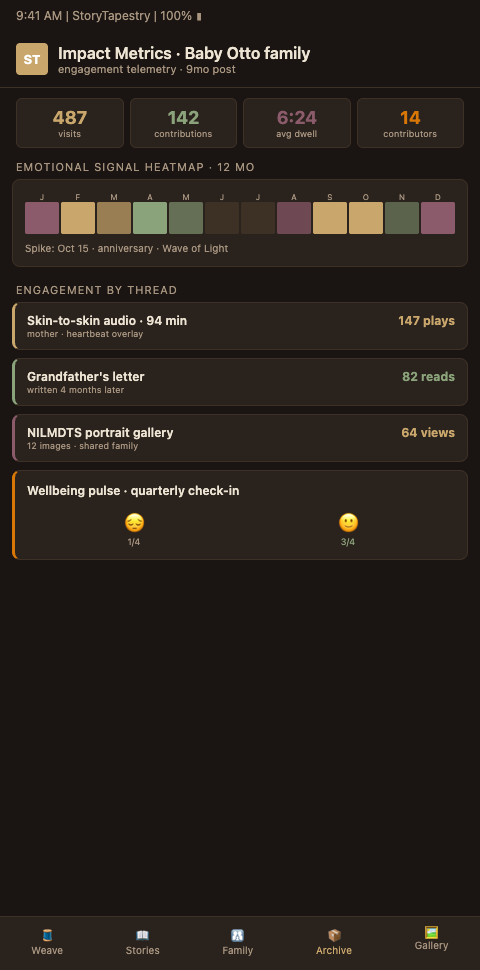 Layer two is tapestry engagement analytics. The platform captures contributor count, entry count, modality distribution, prompt completion rates, and return visit cadence. These are not vanity metrics. The pattern of engagement predicts outcomes. Parents whose tapestries include 15+ contributors show different 12-month grief trajectories than parents whose tapestries stall at 3 contributors. Parents who return to the tapestry monthly in the first six months demonstrate different integration patterns than parents who create and abandon. When tapestry engagement analytics are plotted against PGIS scores, patterns emerge that guide clinical intervention.