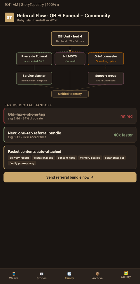 Hospital OB units that want to move from photocopied funeral home lists to coordinated referral infrastructure can adopt StoryTapestry's referral network module. The module handles internal team handoffs, funeral partner vetting and coordination, and ongoing bereavement support referrals with integrated tapestry continuity across every handoff. Our referral network team works with hospital OB leadership, social work departments, and regional funeral partners to build and maintain the network over time.