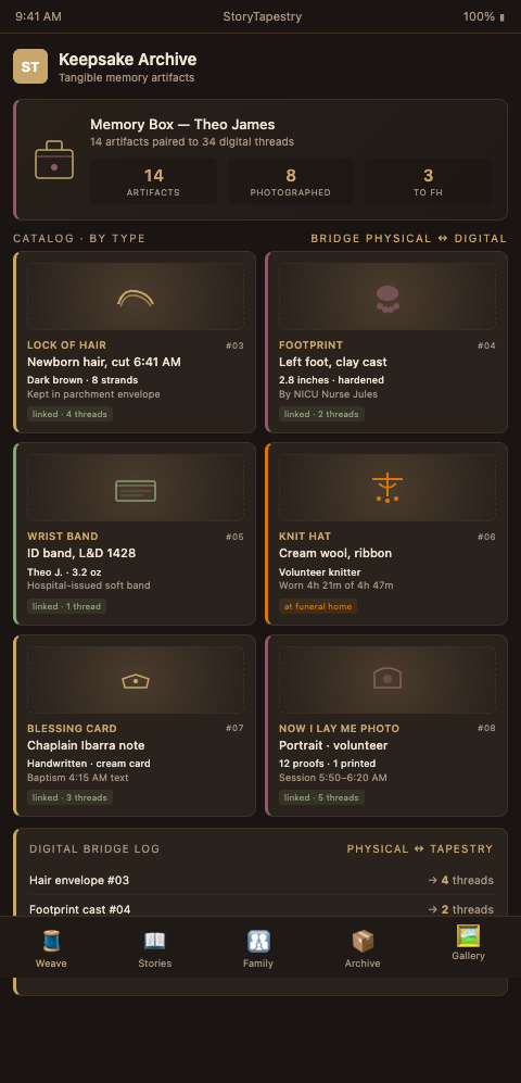 Artifact-centered contribution pathways. When a family brings home a memory box, each item inside can become its own tapestry node. The footprint card links to a prompt asking about the nurse who made it. The lock of hair links to a prompt asking about the afternoon it was cut. The knitted hat links to a prompt asking about the volunteer who knitted it and the first moment the parent saw it on their baby's head. Each artifact accumulates narrative threads that otherwise would disperse across family members' memories.