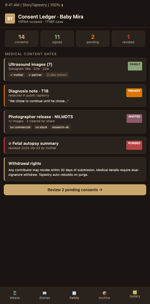 Granular scope per thread. Consent is not binary. StoryTapestry lets parents consent separately to: medical timeline extraction, photography, audio recordings, ultrasound preservation, clinician captions, sibling contributions, public community layer, Wave of Light participation, funeral-home sharing. Each scope has a signed record. Parents can decline some and accept others. This matches what the HIPAA Journal photography rule and the PMC professional-bereavement-photography paper both recommend: consent is specific, not blanket.