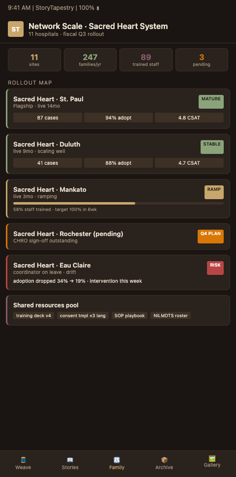 Hospital bereavement programs operating across multiple sites face a choice: watch each hospital reinvent perinatal memorial care in isolation, or build a shared infrastructure that honors local clinical judgment while delivering consistent family experience. StoryTapestry provides the loom, threads, and frames to weave one coherent tapestry across every site in your network. Our implementation team has rolled out programs across networks ranging from three-site community systems to 22-hospital academic networks.