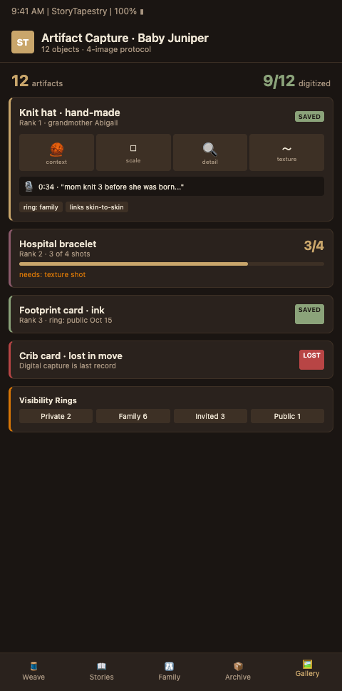 Object ordering matters. Parents often have 5-15 significant artifacts: hospital bracelet, footprint card, hand mold, knit hat, blanket, name card, certificate, candle, crib card, photograph print, letter, small toy, heart-shaped stone, engraved jewelry, lock of hair. StoryTapestry asks parents to rank their artifacts by weight, not alphabetically — the first artifact is the one they would reach for first if they could save only one. This ranking drives the tapestry's visual hierarchy: heaviest objects appear largest, first, and with the richest supporting material.