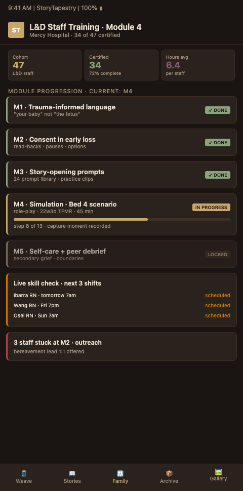 Module three covers the four tapestry thread types that L&D staff contribute directly. Medical Team Moment Documentation captures clinically significant observations parents may not witness: the baby's response to touch during delivery, breathing patterns, moments of eye contact. Micro-Moment Amplification captures parent-observed moments that staff can validate and preserve. Trauma-Informed Guided Storytelling training teaches nurses to offer graduated prompts that meet parents where they are rather than demanding articulation parents cannot access. Sibling and Family Inclusion Pathways training teaches nurses to invite family members present in the room into the tapestry as contributors rather than spectators.