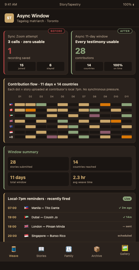 A tapestry does not require all weavers to sit at the loom simultaneously. Each thread arrives when its maker can bring it. The finished textile reveals no gap between the thread woven at midnight Tokyo and the thread woven at dawn Accra. StoryTapestry's async workflow is structured around this premise.