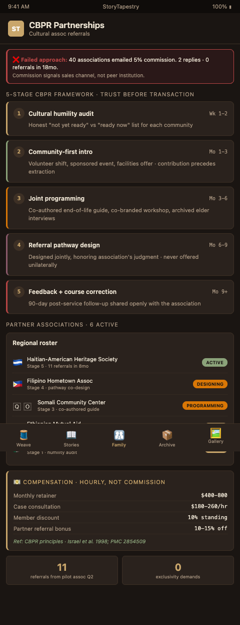 The tapestry reveals itself over months, not meetings. A funeral service that expects referrals in quarter one has misread the framework; one that invests through quarter four sees stable, deep referral relationships by year two. This is why commission-only outreach fails: the incentive horizon is misaligned with the trust-building timeline. StoryTapestry provides the platform to make joint programming outputs tangible — co-authored guides, archived interviews, community education events — giving partners something to point to.