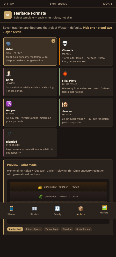 A Ga-speaking family from Accra using the griot mode sees their ancestry recitation rendered with the chapter markers their tradition expects; a Mexican family using ofrenda mode sees layered tiers rather than a vertical feed; a Ukrainian family observing 40-day panakhyda sees the specific candle-lighting and prayer-reading cadence their tradition calls for.