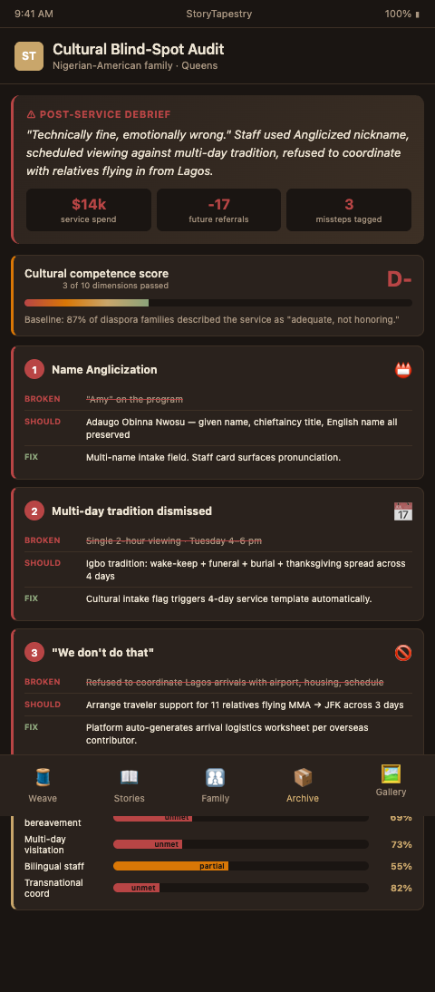 The tapestry metaphor clarifies what immigrant families actually want. They do not want a "standard" memorial with a few ethnic-flavored additions. They want a memorial that assumes multiple heritages, multiple languages, multiple observance timelines, and multiple contributor geographies from the start.