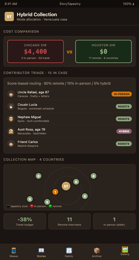 A tapestry benefits from both coarse and fine threads, and a diaspora memorial benefits from both in-person and remote collection. The question is which thread goes where. StoryTapestry's framework routes collection modes based on case-specific signals rather than default preference.