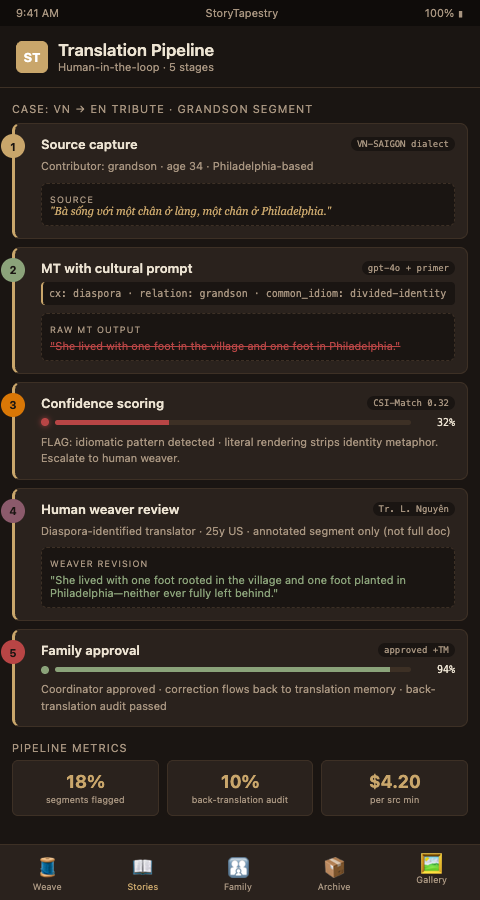 The tapestry metaphor clarifies the solution. A tapestry's threads cross; the loom holds tension; a weaver makes judgment calls at every intersection. Machine translation produces the threads. A human weaver decides where they cross. StoryTapestry combines the two by routing every memorial translation through a staged human-in-the-loop process that treats MT output as a first draft, not a final product.