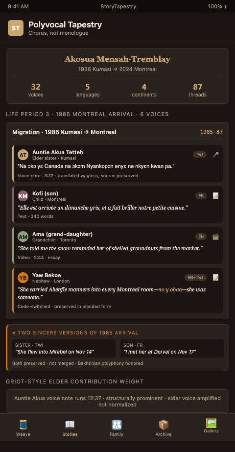 The polyvocal architecture also addresses a specific harm single-voice memorials cause in diaspora communities: the erasure of contributor identities whose voices do not match the dominant language or cultural register. When a Ghanaian-Canadian matriarch's memorial is produced as a single-voice English obituary, the monolingual English-speaking grandchildren see their grandmother accurately, but the Akan-speaking great-aunts in Kumasi see a woman they barely recognize. The memorial has preserved the part of her that was legible in English while erasing the part that lived in Akan. Polyvocal design rejects this sacrifice. Every voice that knew her keeps its place. The Akan great-aunt's voice note in Twi sits alongside the English grandchild's essay, both attributed, both accessible, neither subordinated.