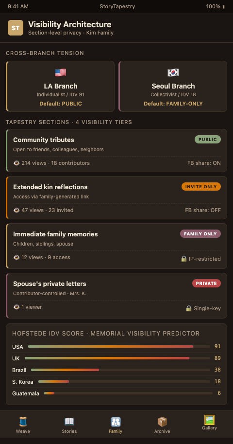 2. Cultural default presets. When a family specifies the deceased's cultural background, StoryTapestry suggests sensible default visibility patterns: Korean families see a closed-family default; American families see an open-public default. Families override as needed, but the defaults reflect documented norms from Hofstede's country data rather than platform assumptions.