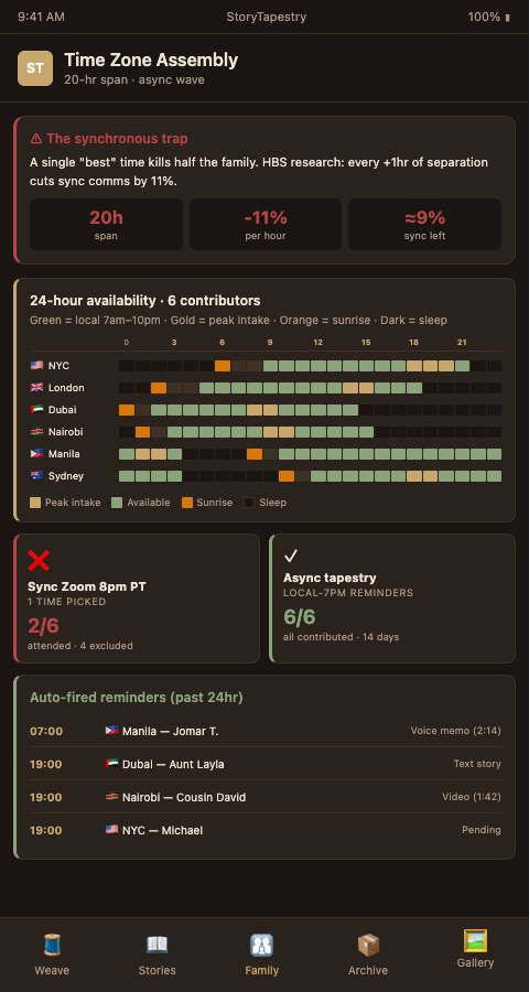 Second, rolling notification scheduling delivers reminders at each contributor's local evening (typically 7 p.m. in their time zone), not at the hosting family's hour. This respects MIT Sloan research on matching technology to task: the task of contributing a story does not require synchronous presence, so scheduling should match each person's natural rhythm.