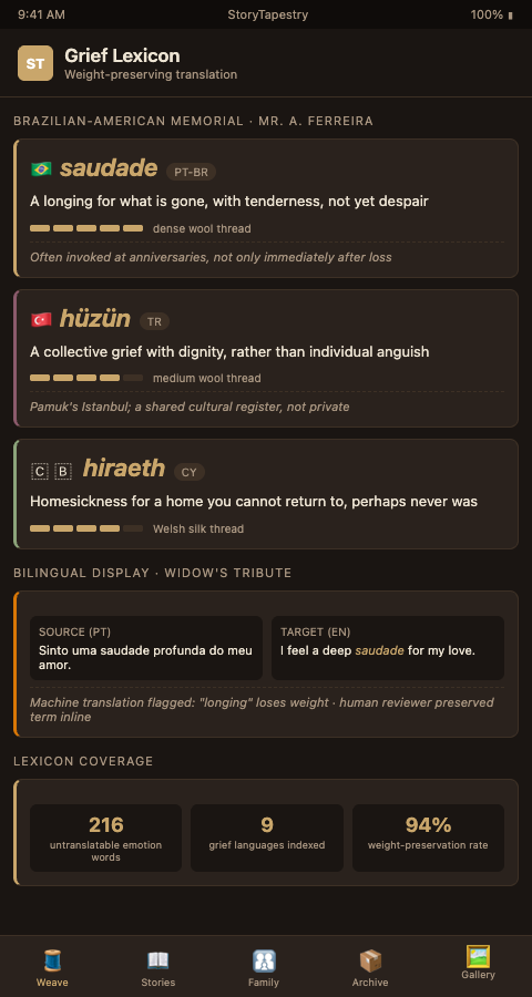 Preserve source terms with inline glosses. Whenever a contributor writes "saudade," "hiraeth," "toska," "hüzün," or another weight-bearing grief term, StoryTapestry keeps the source word and attaches an inline gloss that explains the word's emotional range without substituting it. Readers see "saudade (a longing for what is gone, with tenderness, not yet despair)" rather than a flat English equivalent.
