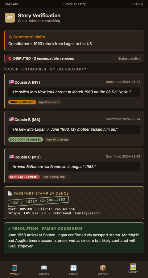 Coordinate verification with genealogical and archival resources. Some claims that are hard to verify through family memory become easy to verify through census records, ship manifests, naturalization papers, military service records, church baptismal registers, or immigration files. StoryTapestry's workflow includes optional integration with major genealogical databases so that family claims about dates, places, and relationships can be cross-checked against documentary records. A disputed 1963 return from Lagos may be resolved in minutes by consulting airline passenger manifests from that era, if the family knows to look.