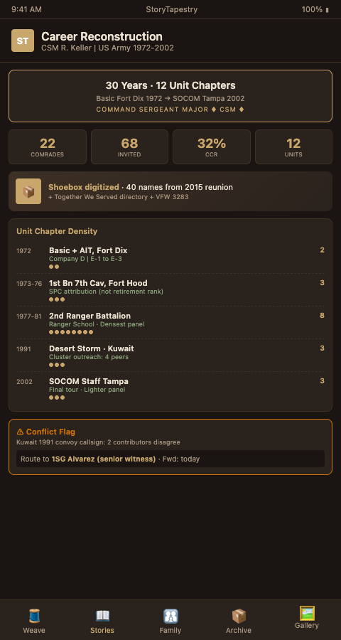 Phase Four: Tapestry Integration. Each contributor's account was tagged to its relevant chapter on the career tapestry. A single story from a 1977 Ranger School classmate about Robert's response to a helicopter extraction gone wrong was tagged to the 1977 chapter. A 1991 Gulf War story about his handling of enemy prisoners went to the Desert Storm chapter. When multiple contributors touched the same episode, StoryTapestry's conflict-flagging surfaced inconsistencies—two contributors remembered the callsign of Robert's Kuwait convoy differently—which the coordinator resolved by routing back to the senior contributor with direct knowledge.