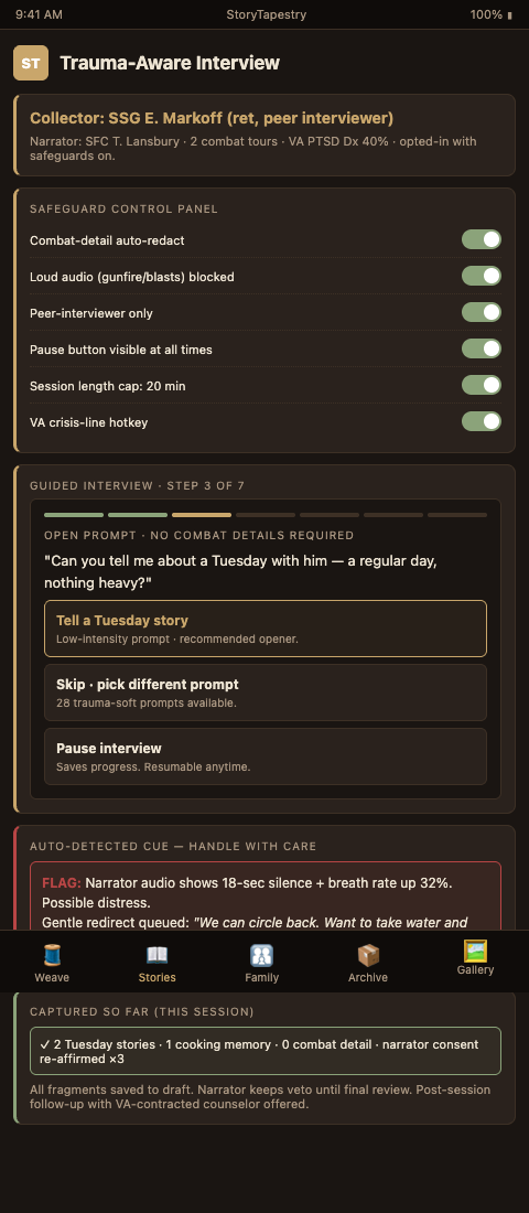 The fourth element is the explicit stop signal. Veterans are taught a two-finger gesture that pauses the recording and triggers a 10-minute break. The platform indexes the pause so the final tapestry can either skip the paused section entirely or, with veteran permission, include it with a note ("Sergeant Hale chose to pause here and returned to this topic in a later session"). The stop signal must be practiced before the first question, not explained in passing. Interviewers who skip the practice find veterans never use the signal even when they need it.
