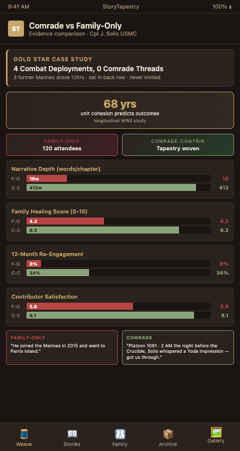 Family healing outcomes. Families who receive comrade-contributed memorials report higher satisfaction with the memorial process and lower post-memorial regret scores than families who produce family-only memorials. The mechanism: comrade contributions answer questions families have carried for years without knowing how to ask. The Gold Star parents who sat in the back of their son's memorial never learned what their son's four deployments had been like. A comrade-contributed memorial would have answered this for them.