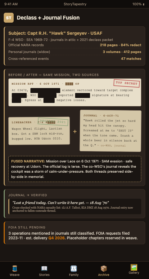 StoryTapestry treats declassified records and personal journals as two warp threads that run the full length of a veteran's life, with family stories forming the weft that binds them. Instead of asking families to choose between the sanitized official record and the raw personal diary, the platform lets both sit side by side on the same timeline, each annotated and cross-referenced so the memorial becomes a living document that grows as more records clear declassification review.