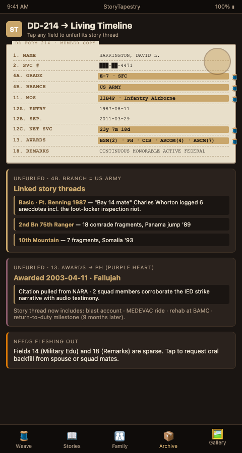 An interactive timeline built from the DD-214 turns fifteen fields of bureaucratic shorthand into the chronological skeleton of a life. StoryTapestry parses each field into a timeline node, glosses abbreviations inline, and surfaces context that turns the document into narrative. The tapestry runs from date of entry to date of separation with duty stations, schools, deployments, and decorations marking the weave. Every thread has a time and a place.