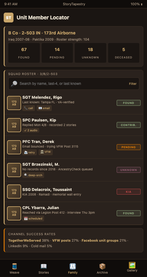 Locating and interviewing former unit members for memorial contribution works when the funeral home operates as a structured oral history project rather than an ad hoc outreach effort. StoryTapestry provides the outreach and interview scaffolding, treating every comrade as a thread-holder whose contribution gets woven into the exact deployment, duty station, or post-service chapter where the relationship formed.