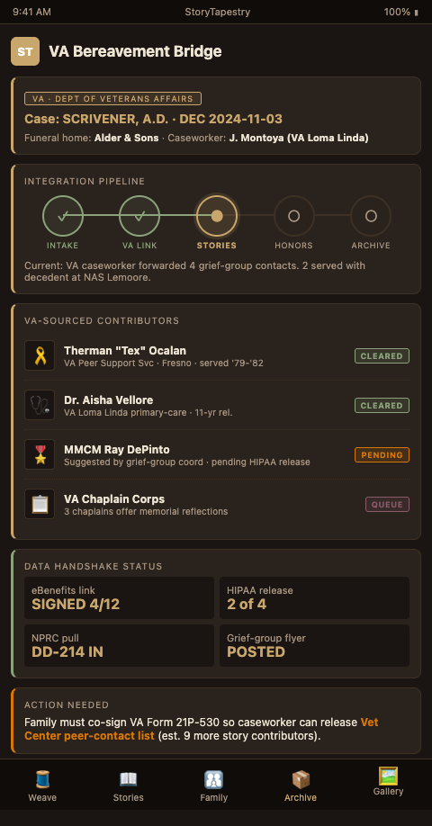 Third, the bereavement-counseling-integration thread: Vet Center bereavement counselors work with families who often benefit from reviewing memorial content as part of grief processing. The tapestry provides shareable, counselor-accessible views so the family's therapist can engage with the memorial if the family chooses. This is not a clinical integration but a family-consent integration: the tapestry becomes material the family may bring into counseling sessions.