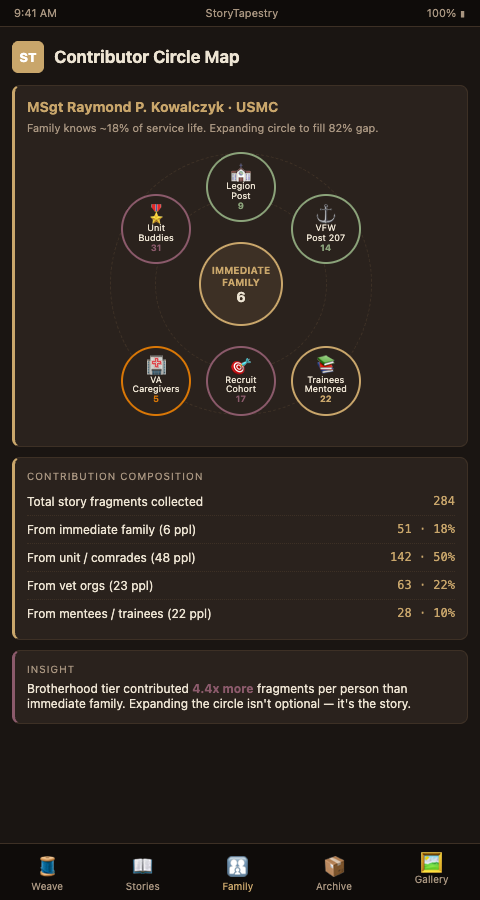 Opening veteran memorials beyond the family requires an explicit architecture for non-family contribution. StoryTapestry builds that architecture around the tapestry metaphor: family threads form the warp running the length of the life, while unit and community threads form the weft that crosses through each deployment, duty station, and post-service chapter. Both are necessary for the fabric to hold.