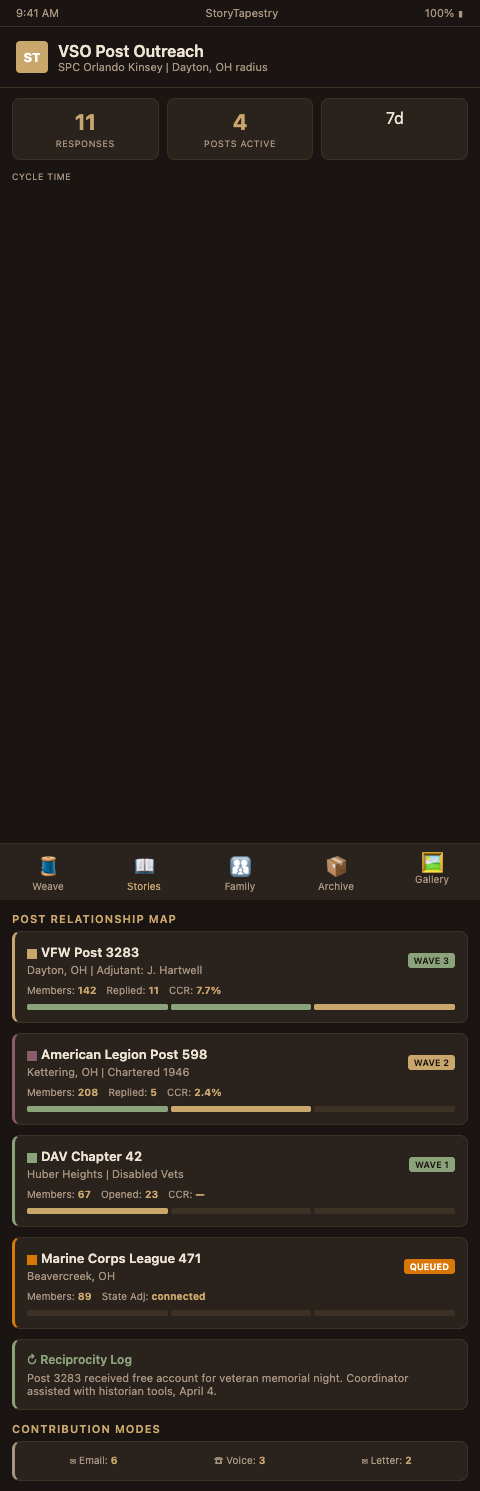 StoryTapestry's VFW and American Legion outreach framework treats posts and Legion halls as the load-bearing social infrastructure for veteran memorial coordination, and weaves outreach workflows that respect post autonomy while enabling the coordinator to query at scale. The framework rests on four components: post relationship mapping, graduated outreach, contribution workflow, and ongoing reciprocity.
