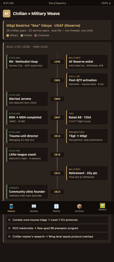 StoryTapestry's Dual-Life Narrative Integration treats military and civilian chapters as two warp threads running the full length of a veteran's adult life, with the weft (relationships, values, habits, skills transferred across both) binding them together. The tapestry does not segregate the chapters into "Part One: Military" and "Part Two: Civilian"; it runs them side by side so a viewer sees what the veteran was doing in uniform in 1994 alongside what the veteran was doing in civilian work in 2004, with the continuities visible across the gap.